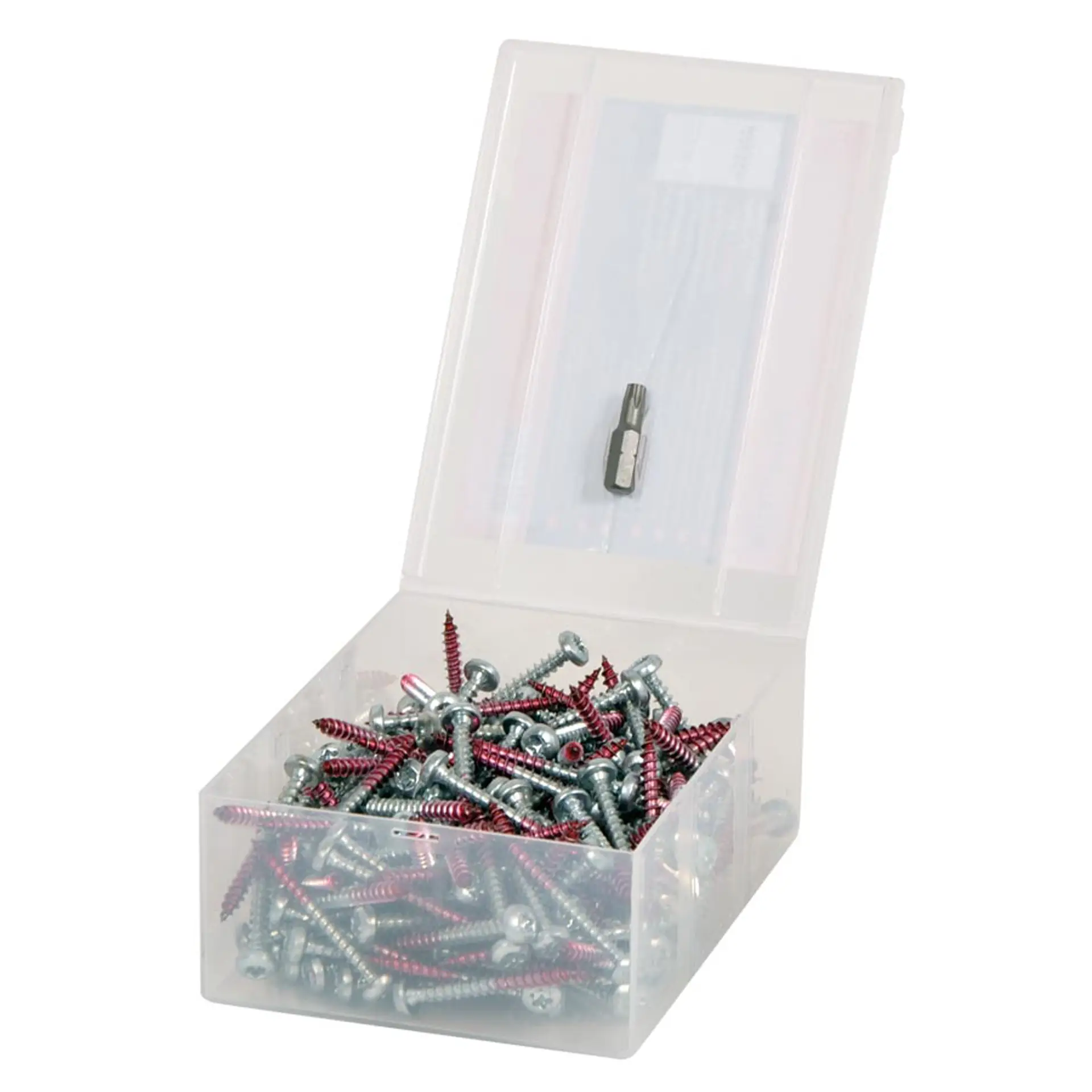 Selbstbohrende Schrauben mit Zylinderkopf, 4,5 x 40 mm, zur Befestigung von Zwischenisolatoren. Die farblose Wachsschicht macht Vorbohren überflüssig. Einschließlich Schraub- Bit.