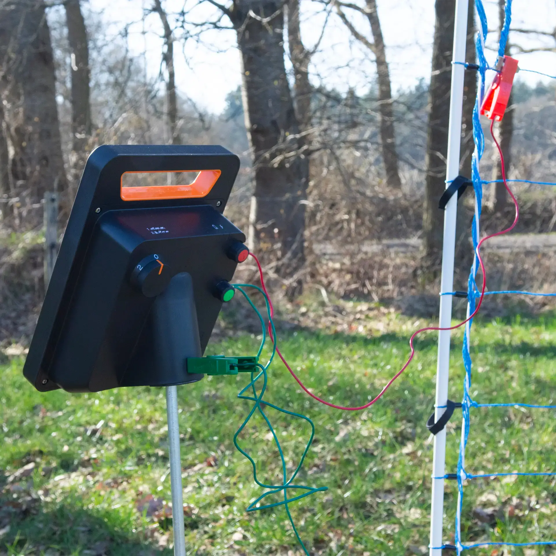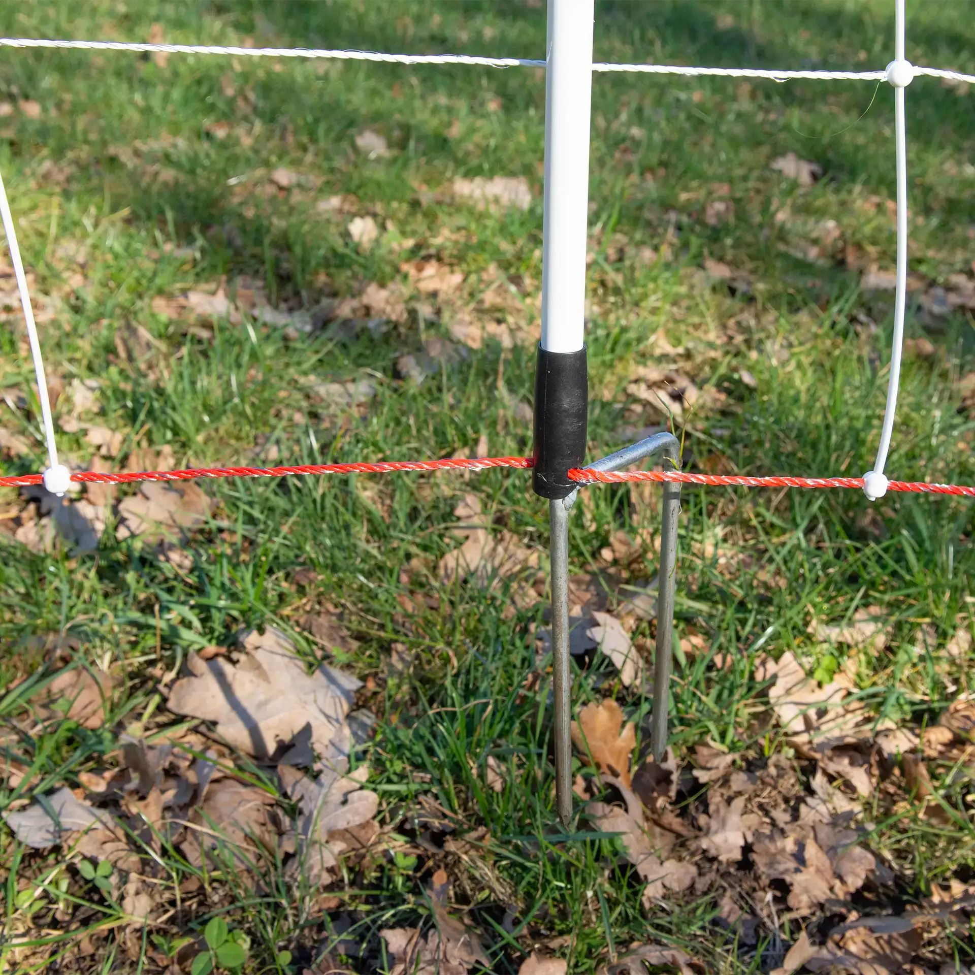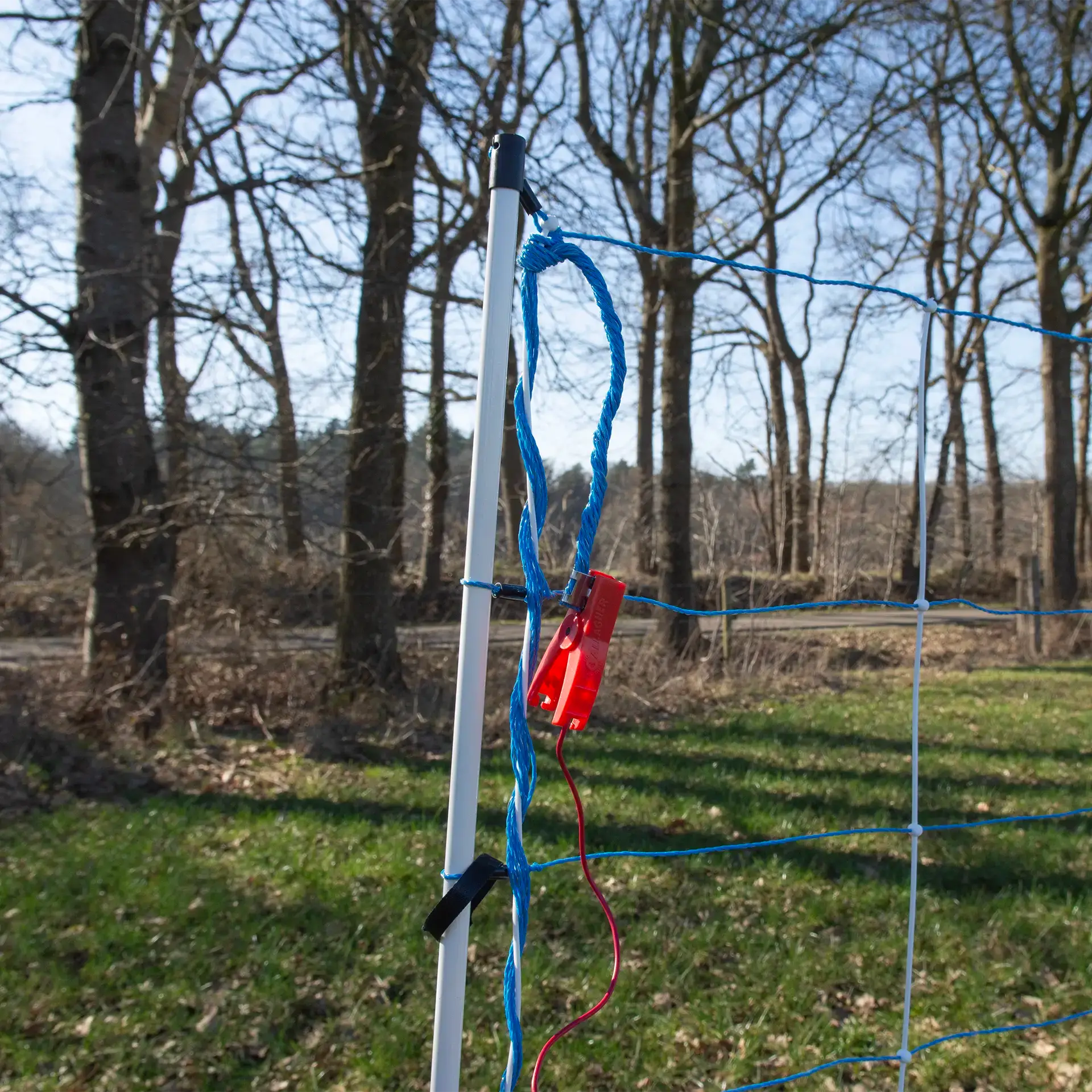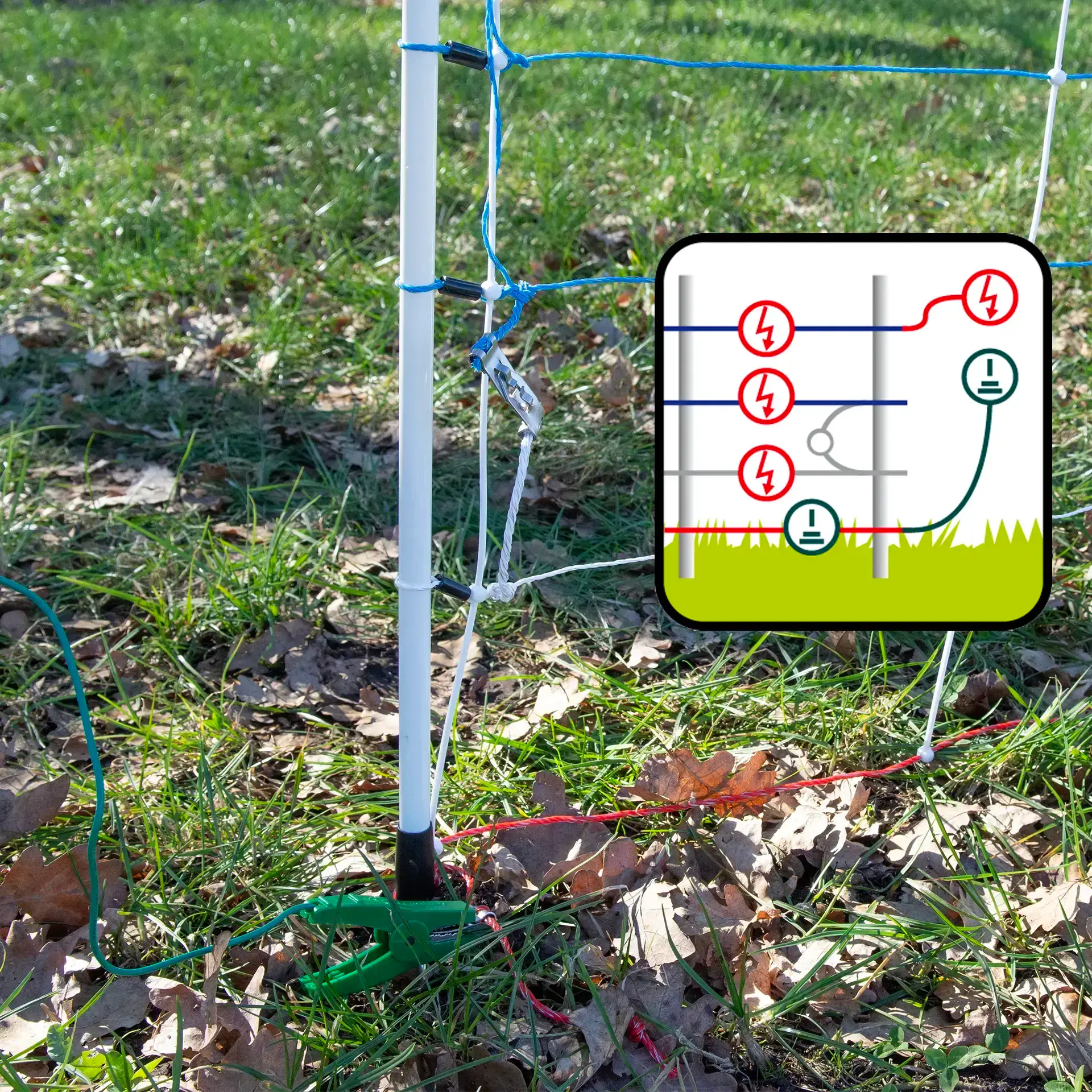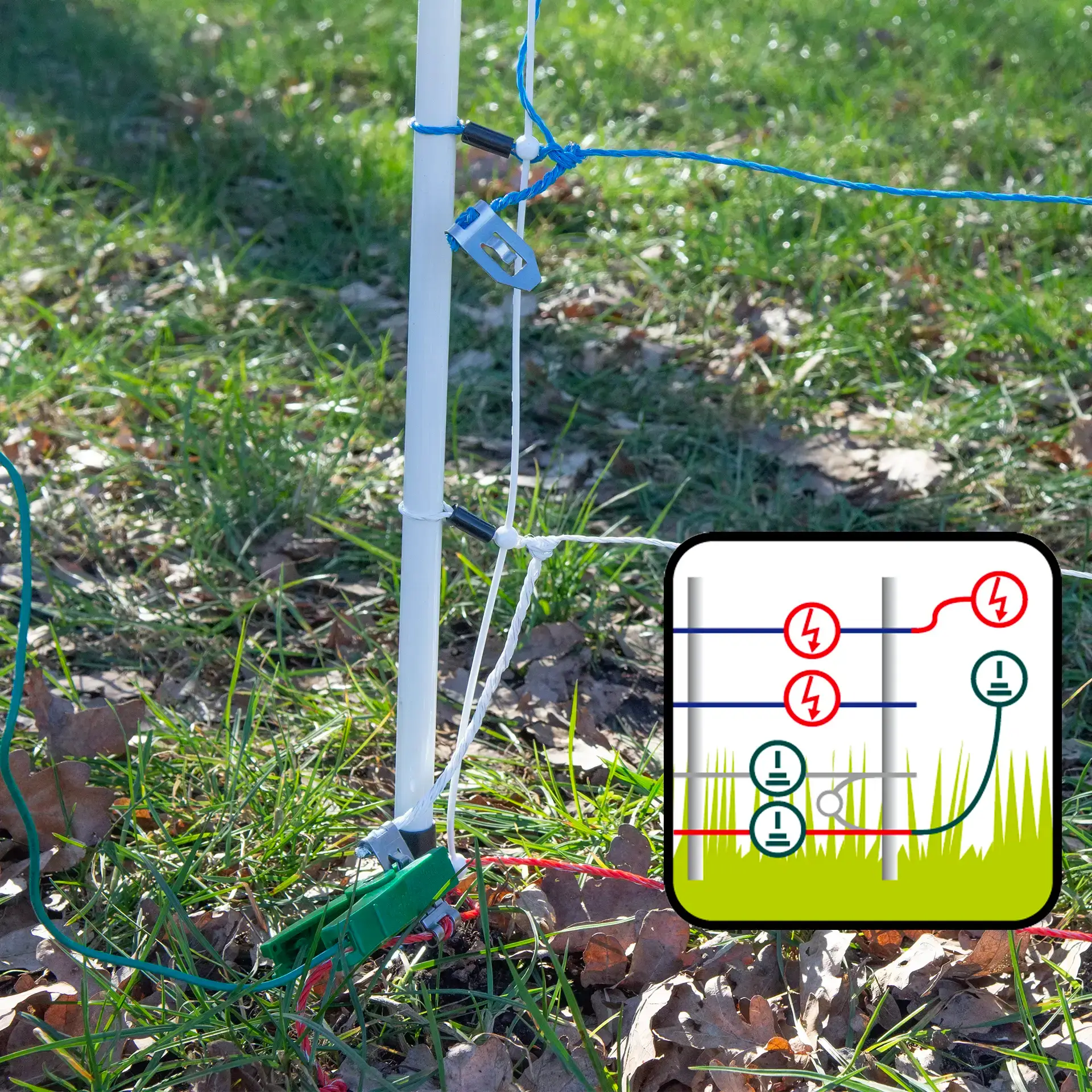 Die Pfähle im Netz sind 3 cm höher als das Netz selbst. Dies wurde so konzipiert, da die vertikalen Verstärkungen in der Praxis auf dem Gras aufliegen, während die Pfähle bis zum Boden gedrückt werden. Diese zusätzliche Länge gleicht diesen Unterschied aus und sorgt dafür, dass der obere Draht gerader verläuft. Der obere Draht ist verstärkt und besonders leitfähig. Auch die untere Litze ist verstärkt und mit Leitern versehen. Diese untere Litze kann bei trockenem oder steinigem Boden mit einer Klammer als zusätzliche Erdungsmöglichkeit verwendet werden. Verbinden Sie diesen Draht jedoch niemals mit einem Plusdraht. Ein cleveres Detail ist die variable Anschlussmöglichkeit des zweiten Litzen vom Boden aus. Bei höherem Gras kann diese Litze an den Minuspol (Erdung) angeschlossen werden, um Stromverluste zu vermeiden und die Wirksamkeit der unteren Litzen etwas zu erhöhen. Verlegen Sie das Netz in niedrigerem Gras? Dann empfehlen wir, den zweiten Litze mit dem Metallclip an den dritten Litze anzuschließen und sie so zu einem Pluslitze zu machen. Alle Litzen ab der dritten Litz sind Pluslitzen. Nach dem Aufrollen kann das Netz mit den drei mitgelieferten Klettverschlüssen zusammengebunden werden, damit es während des Transports oder der Lagerung kompakt bleibt. Für kleine Reparaturen wird standardmäßig ein Reparaturset mitgeliefert.