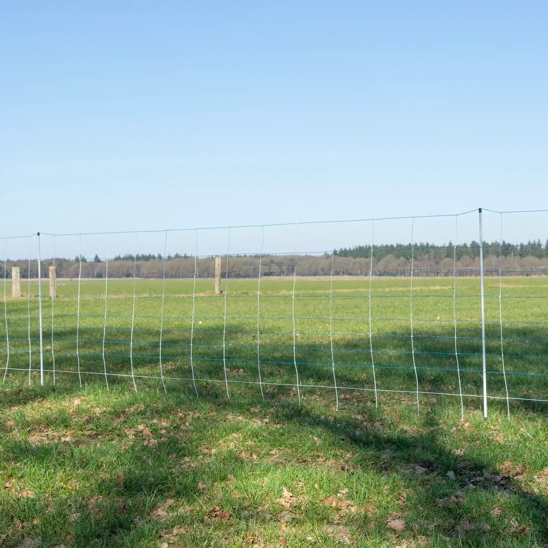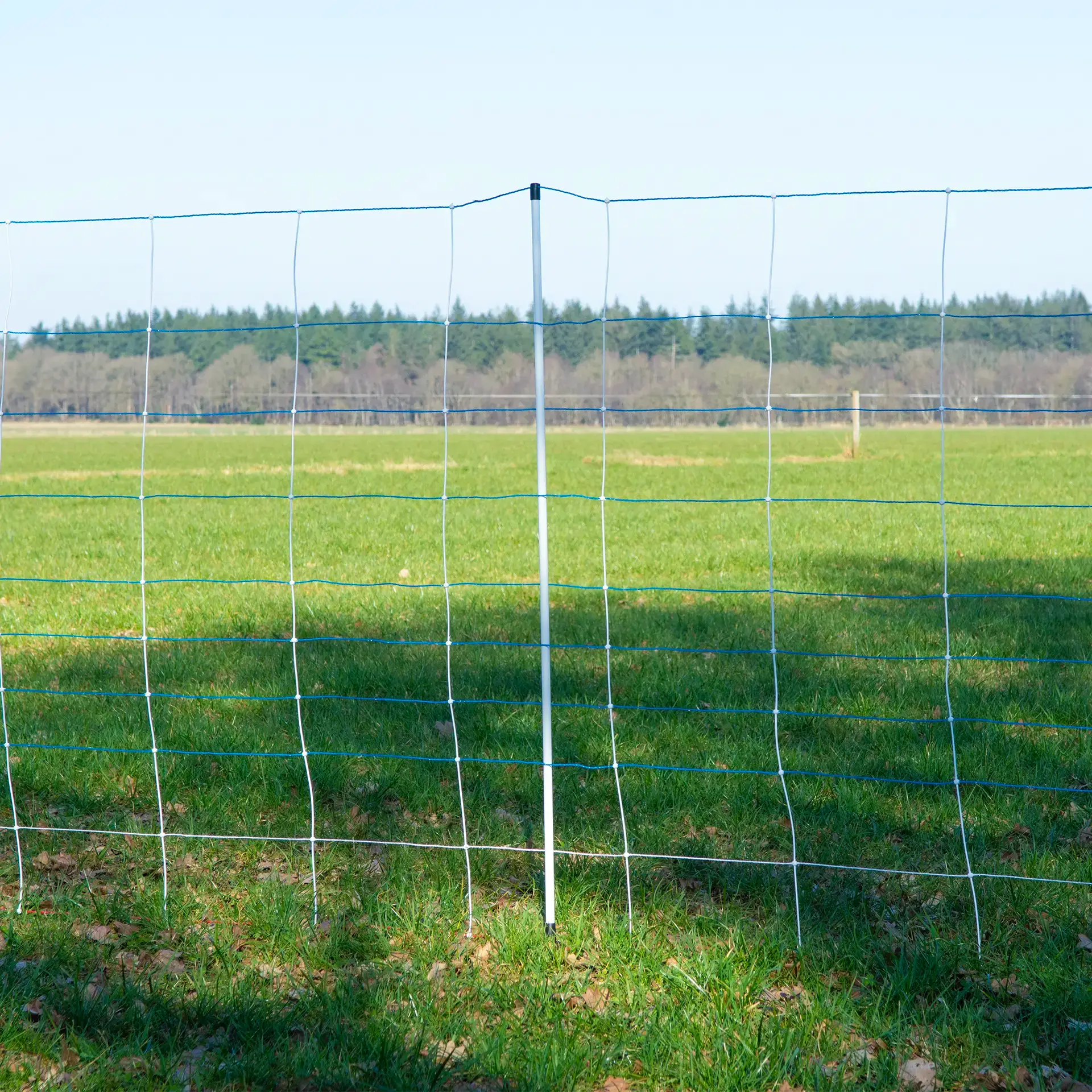 Das blaue Netz mit weißen Pfählen ist für Wildtiere gut sichtbar. Die 10 horizontalen Litzen sorgen für maximale Wirksamkeit. Dank 6 Kupferleitern von 0,25 mm hat das Netz eine hervorragende Stromleitung von nur 0,05 Ohm pro Meter. Außerdem sind 40 Edelstahlleiter über das Netz verteilt. Dadurch ist es 14-mal leitfähiger als ein Standard-Wolfsnetz, was zu weniger Stromverlust und einer höheren Spannung führt, insbesondere wenn Sie mehrere Netze miteinander verbinden. Die Konstruktion ist praktisch gestaltet mit extra stabilen Pfählen mit doppelten Edelstahlspitzen für maximale Stabilität und minimale Durchbiegung. Durch vertikale Verstärkungen hängt das Netz nicht zwischen den Pfählen durch und bleibt somit auf der richtigen Höhe.