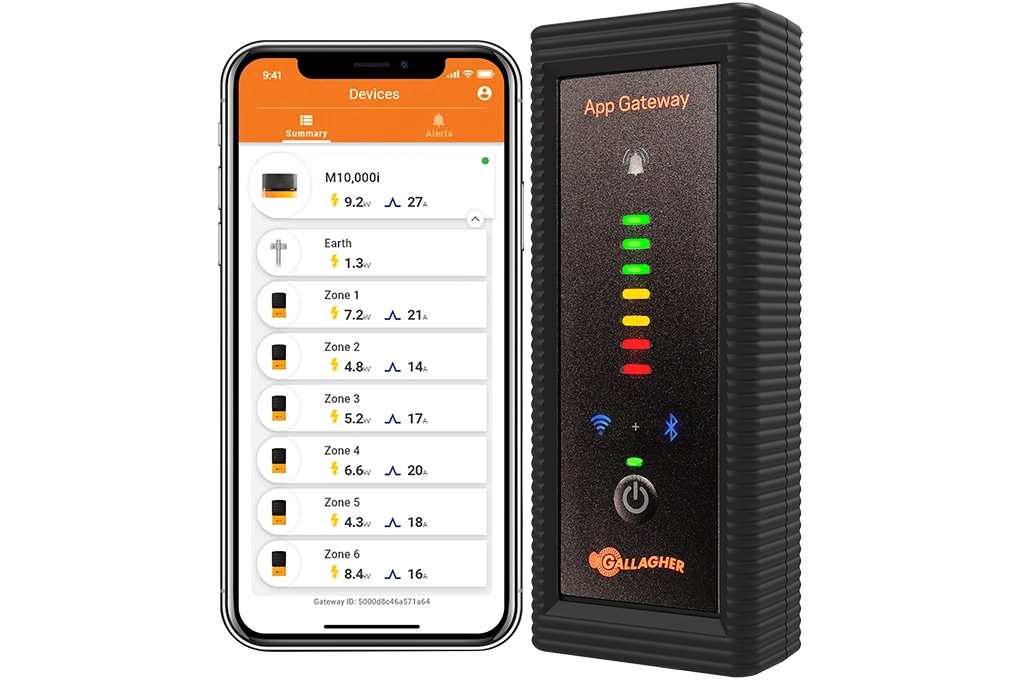 Mit der kostenlosen App von Gallagher Ag Devices können Sie den Zustand Ihres Zauns überall und jederzeit überprüfen. Im Falle einer Störung erhalten Sie automatisch eine Benachrichtigung auf Ihrem Smartphone. So haben Sie immer die Kontrolle und gewährleisten die ultimative Sicherheit für Ihre Tiere. Darüber hinaus können Sie mit der App das System ganz einfach ein- und ausschalten und die Geräteeinstellungen ändern. Um Ihre i Series Weidezaungeräte mit der kostenlosen App zu verwenden, benötigen Sie das i Series Zubehör 'App gateway controller'.
