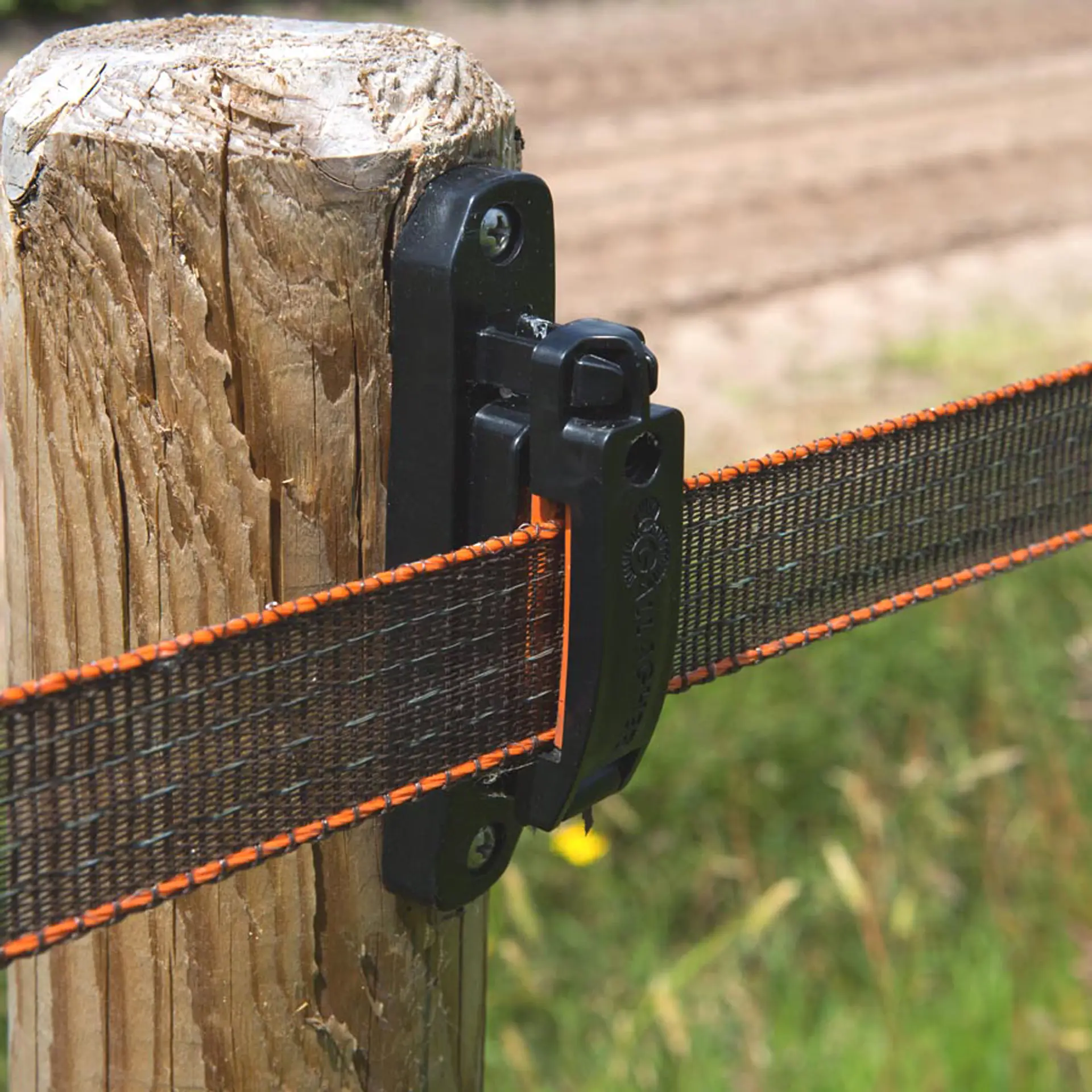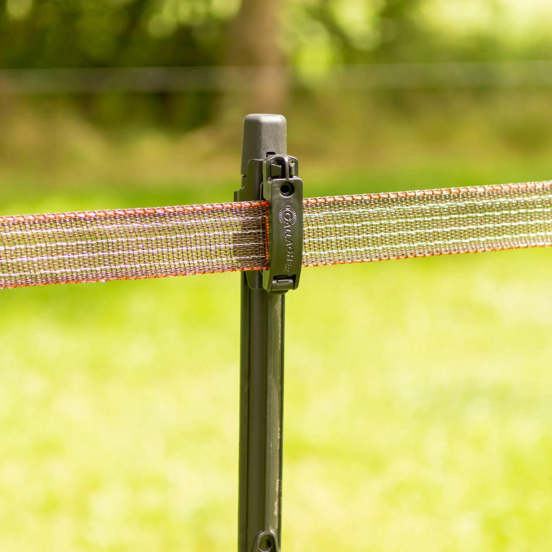 Mit einer Zugfestigkeit von 520 kg ist das Band stark, reisst jedoch an den richtigen Stellen, wenn ein Pferd in Panik durch den Zaun zu fliehen versucht. Hierfür ist es wichtig, robuste Isolatoren und Eckpfähle zu verwenden. Wenn schwache Teile früher brechen als das Band, geht der Sicherheitseffekt verloren. Gallagher bietet daher passende Turbostar-Isolatoren und Zubehör.