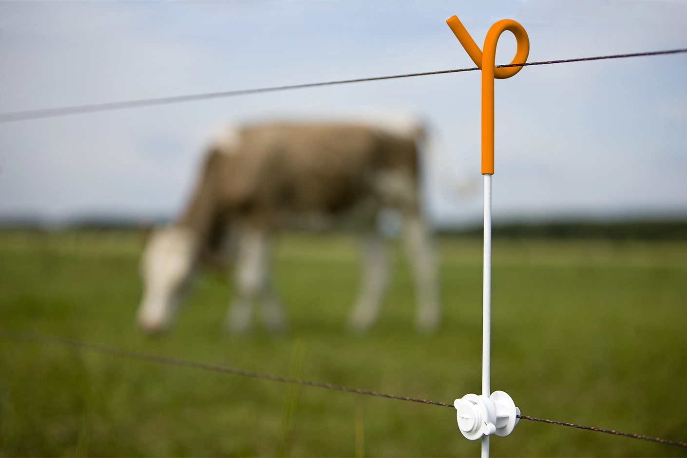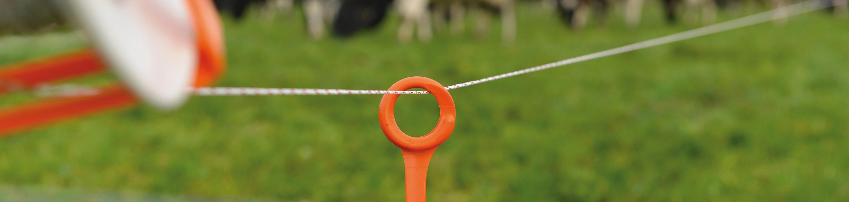 Schritt 4: Nehmen Sie die beweglichen Pfähle in die Hand und setzen Sie alle 10 m einen Pfahl. Hängen Sie die Litzen in der gewünschten Höhe an den Pfählen ein. Der Pfahl "Vario" von Gallagher, der Steigbügelpfahl und der Schafpfahl sind mit Nummern versehen, damit Sie sich die Drahthöhen merken können. Die mobilen Pfähle sind nun platziert, und die Litzen können festgezogen werden.