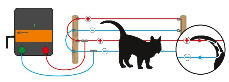 The wire is run through the insulator (from A to B) and a second wire is run back (from B to A) through the same insulator. The wires must not touch each other. As soon as the cat's paws are on the fence, it makes contact with the earth wire (-). It then closes the circuit by touching the + wire with its head. This creates a startle effect, causing the cat to jump back and not enter your garden. You can also combine both systems should your garden contain both parts with and parts without a fence. Do you want to chase cats away from your garden? But don't know which fence best suits your situation? We will be happy to give you tailored advice.