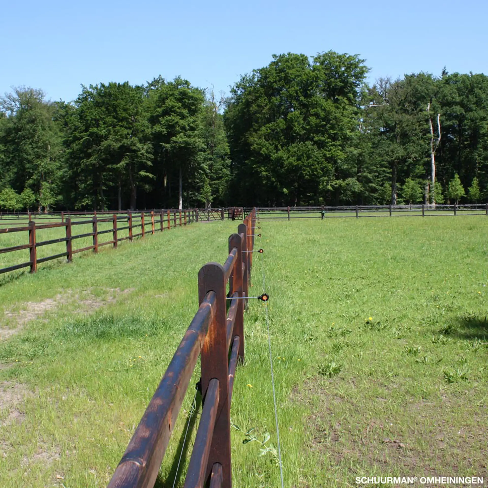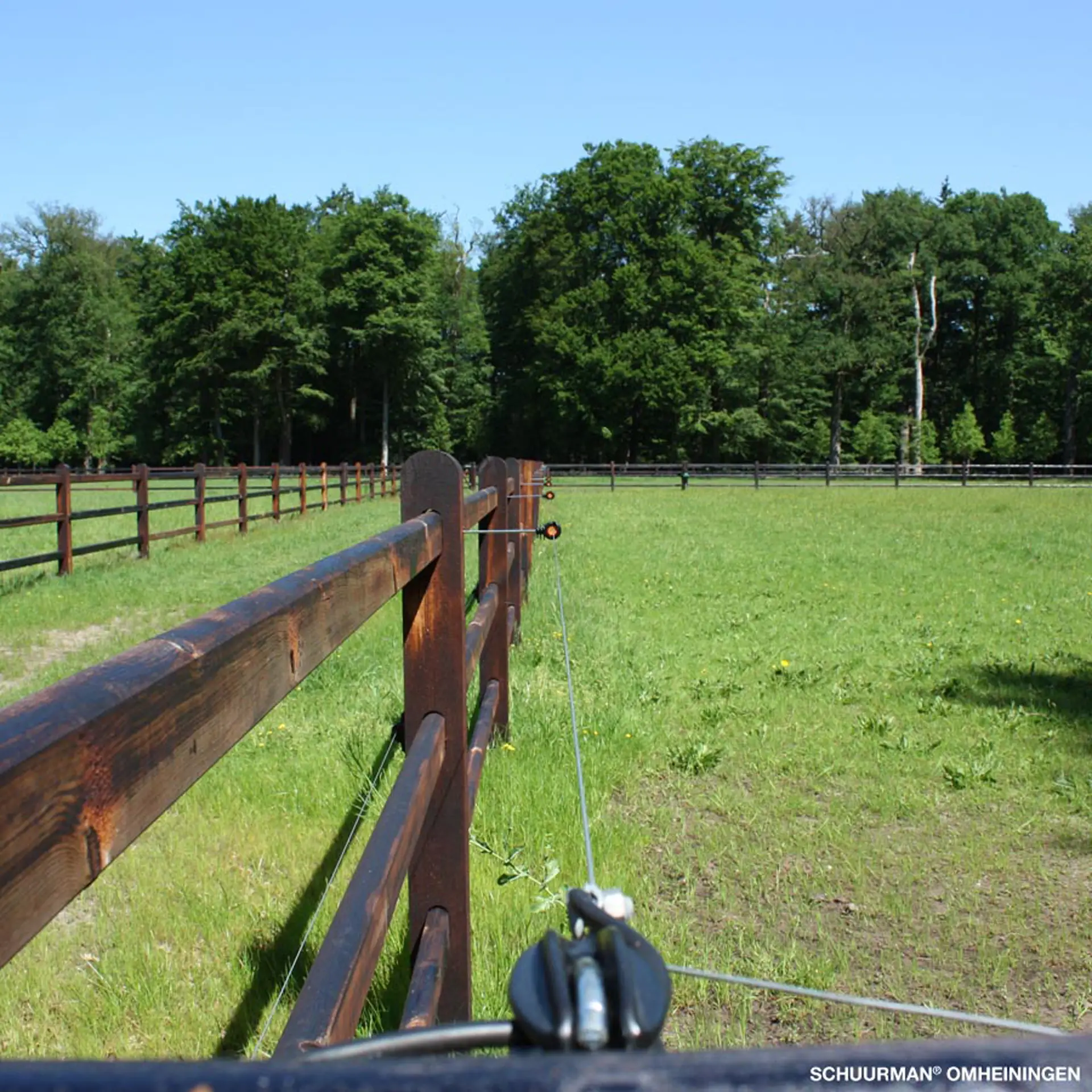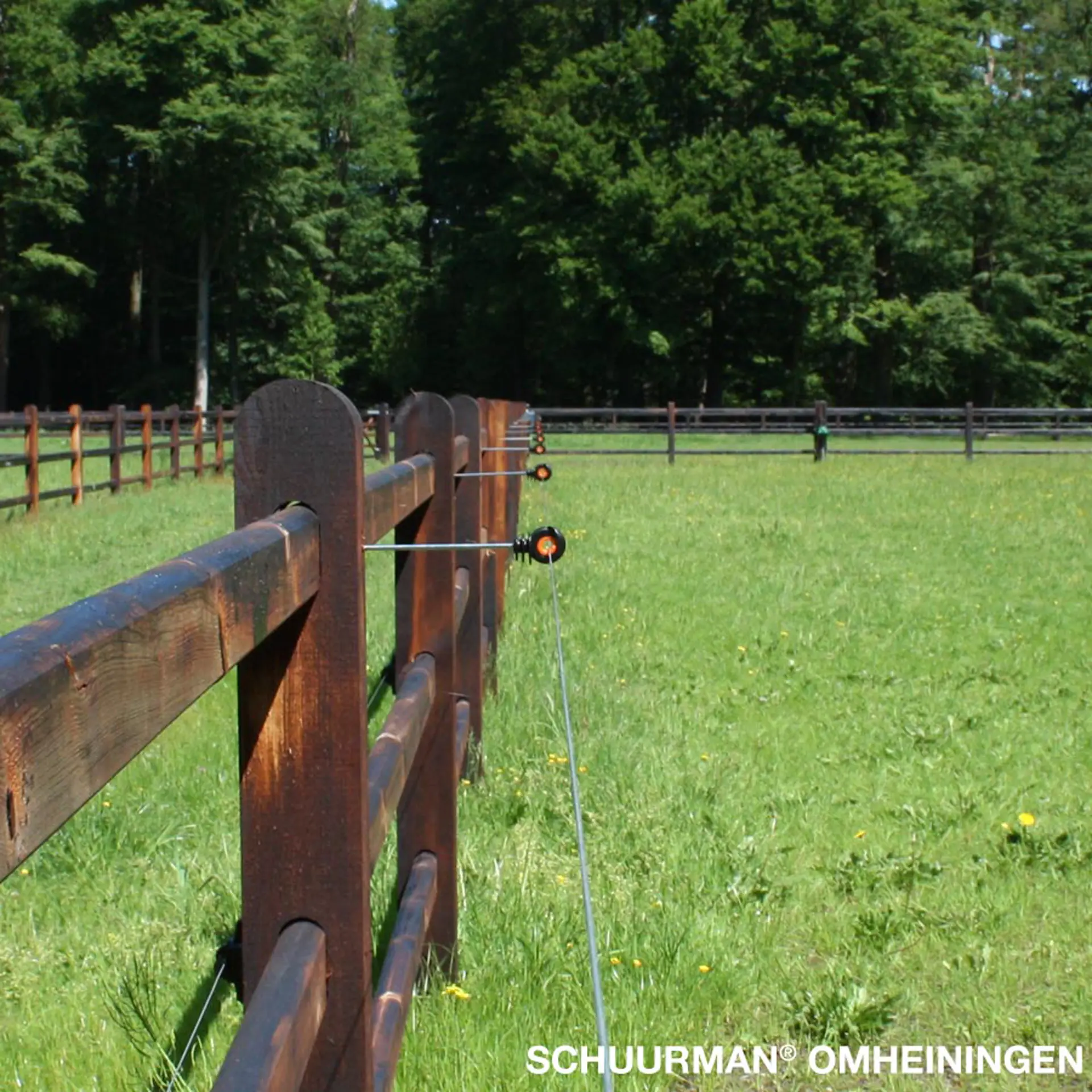 A robust offset screw- in insulator for wooden post fences - used to protect and electrify non- electric fences.