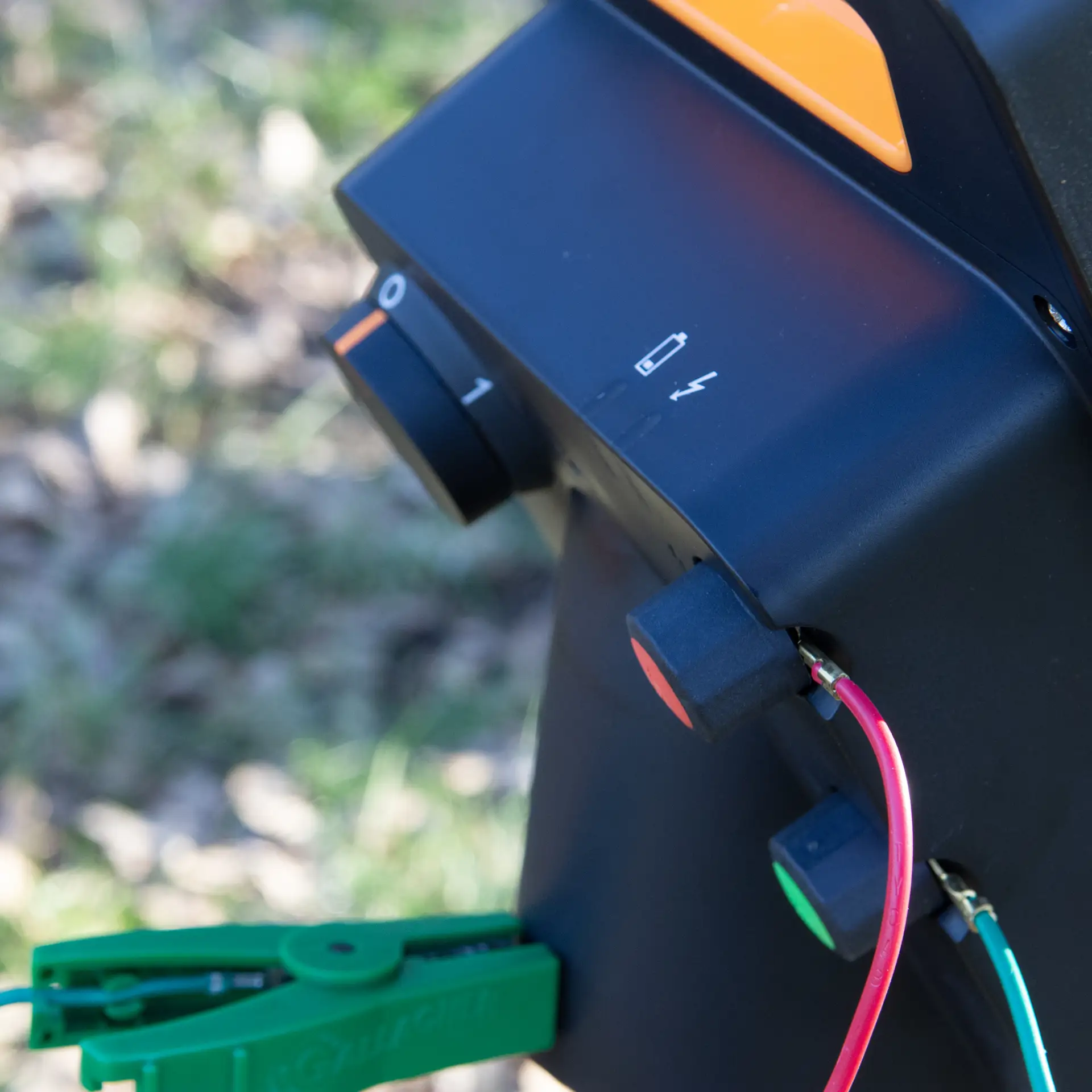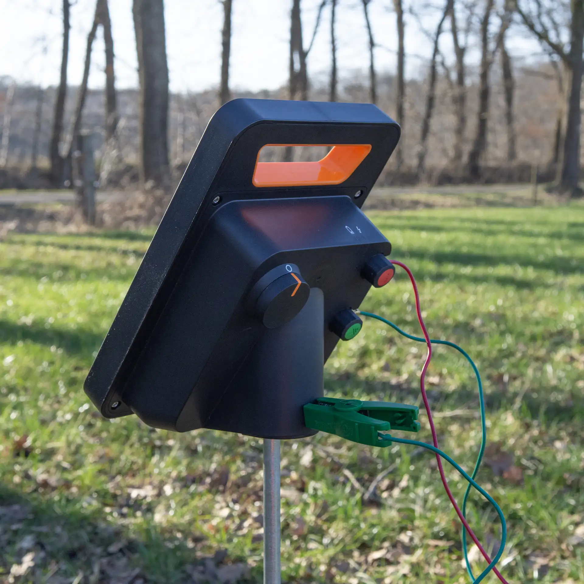 Place the device with the solar panel facing south-west and free of vegetation. Earth it with a single 1-metre earth stake (#008735) or a double 2x0.5m earth stake (#090457). Do not place it on the ground, but use the optional bracket (#571126) to mount it on a post or earth stake, or the stand (#007509) that can be driven into the ground and also serves as an earth stake. The red and green cables with crocodile clips to connect the device to the fence and earth stake are included. After purchase or storage, allow the device to fully charge in daylight for three days by placing it in the off position facing south. Also do this when the red LED light indicates that the battery is almost empty. For long-term storage, keep the device in a dark, dry and ventilated place.