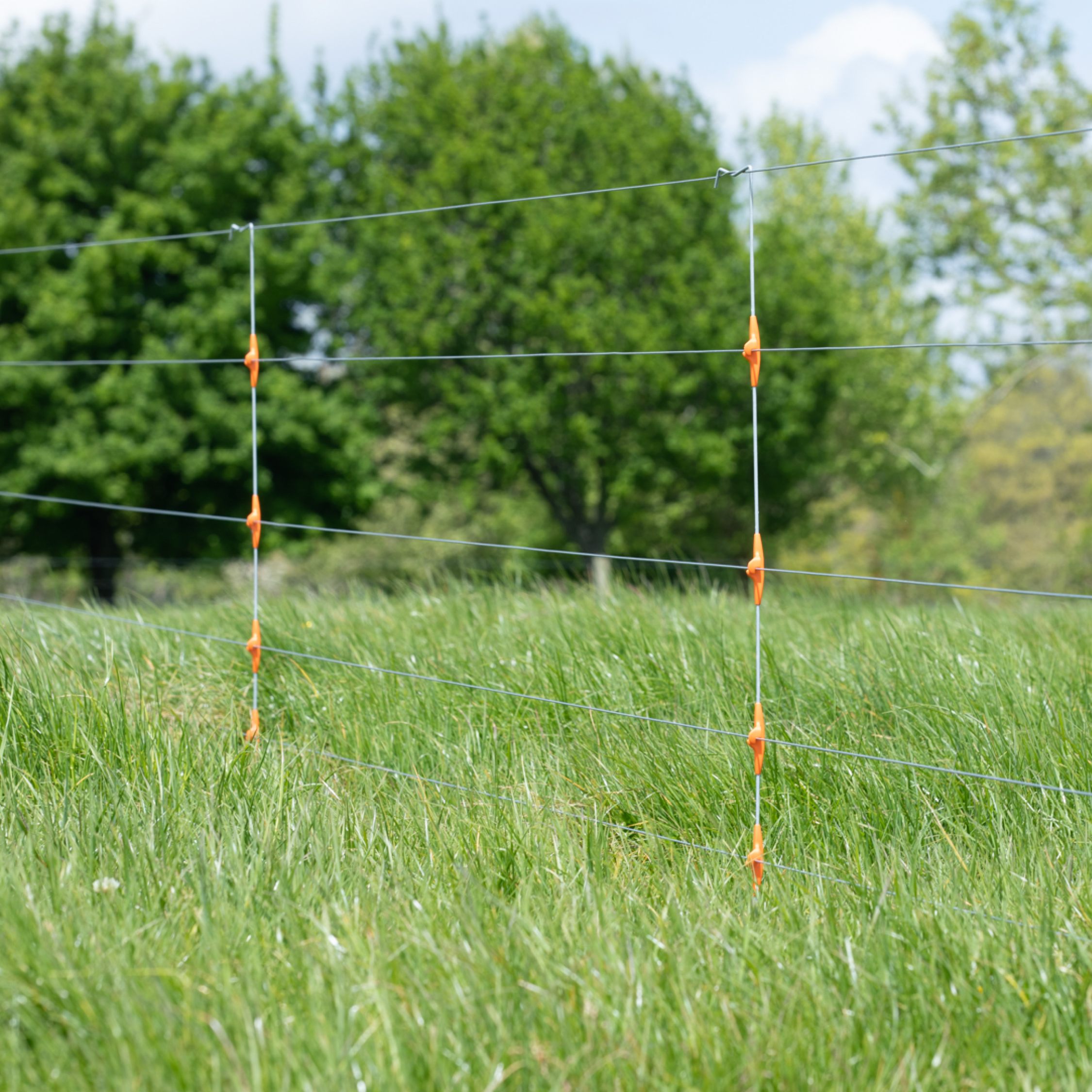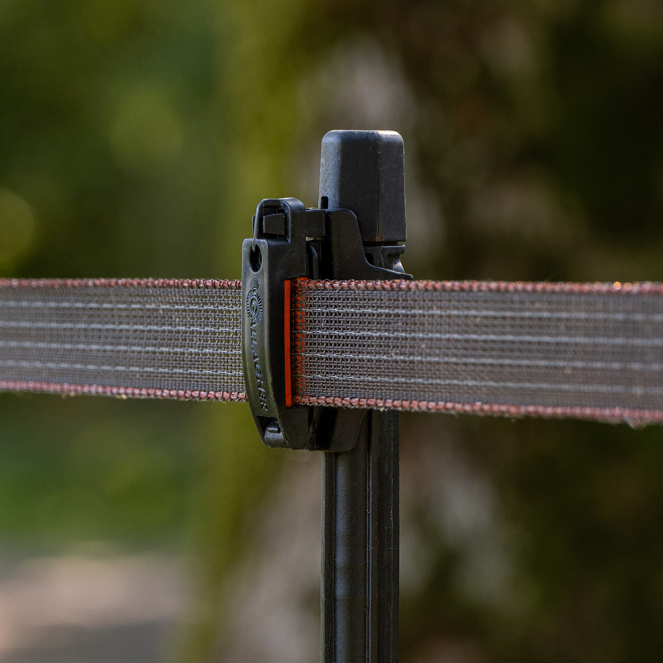 - Des clips/isolateurs solides : Le piquet Line Post entièrement isolé empêche toute perte de puissance. Les clips solides, adaptés aux fils et aux cordons, peuvent facilement être fixés à différentes hauteurs. Ils peuvent supporter une force allant jusqu'à 160 kg, ce qui les rend deux fois plus résistants que les isolateurs à écrou standard. Des clips pour ruban de clôture sont également disponibles.