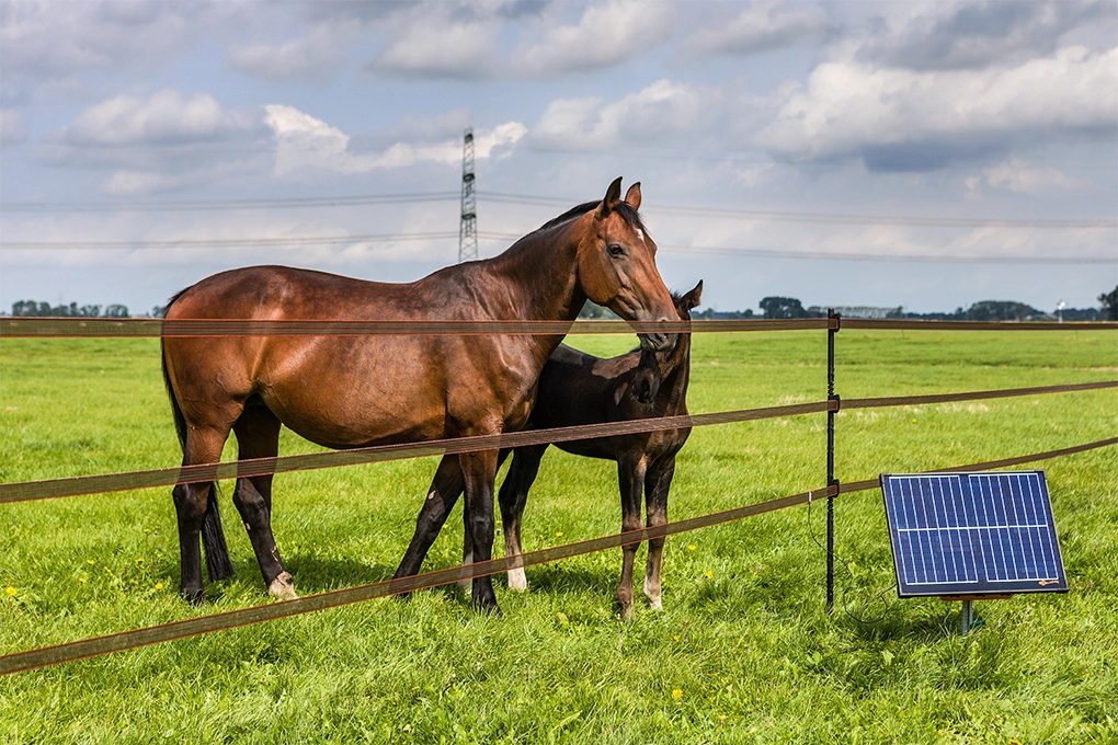 Quelle longueur voulez-vous alimenter ? Cet aspect ne joue plus aucun rôle. De 500 mètres à 30 kilomètres, il existe un appareil Gallagher pour chaque distance. Pour les distances encore plus longues, vous pouvez opter pour une centrale solaire. Il s'agit d'une palette en plastique surmontée d'un grand panneau solaire et d'un boîtier anti-vol électrifié contenant l'électrificateur. Cette solution peut alimenter jusqu'à 80 km de clôtures.