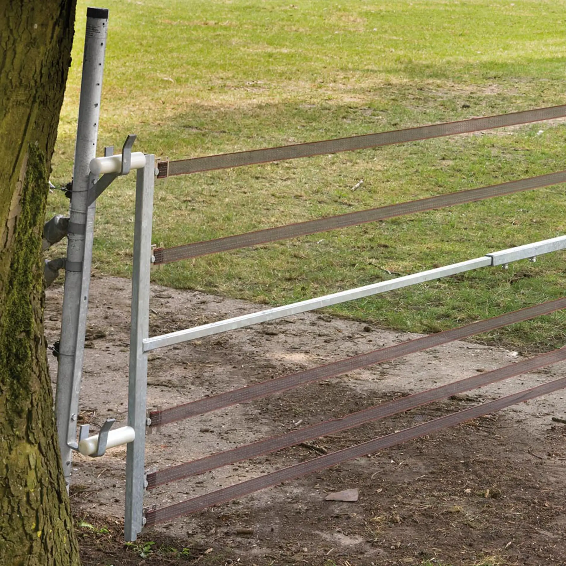 Porte électrifiée très efficace et sans entretien, réglable suivant déclivité et garantie longue durée. Pour toutes vos clôtures électriques permanentes. Livrée sans fil. Jusqu'à 4.20 m. Hauteur : 1m. (Attention : la porte ne se referme pas automatiquement)