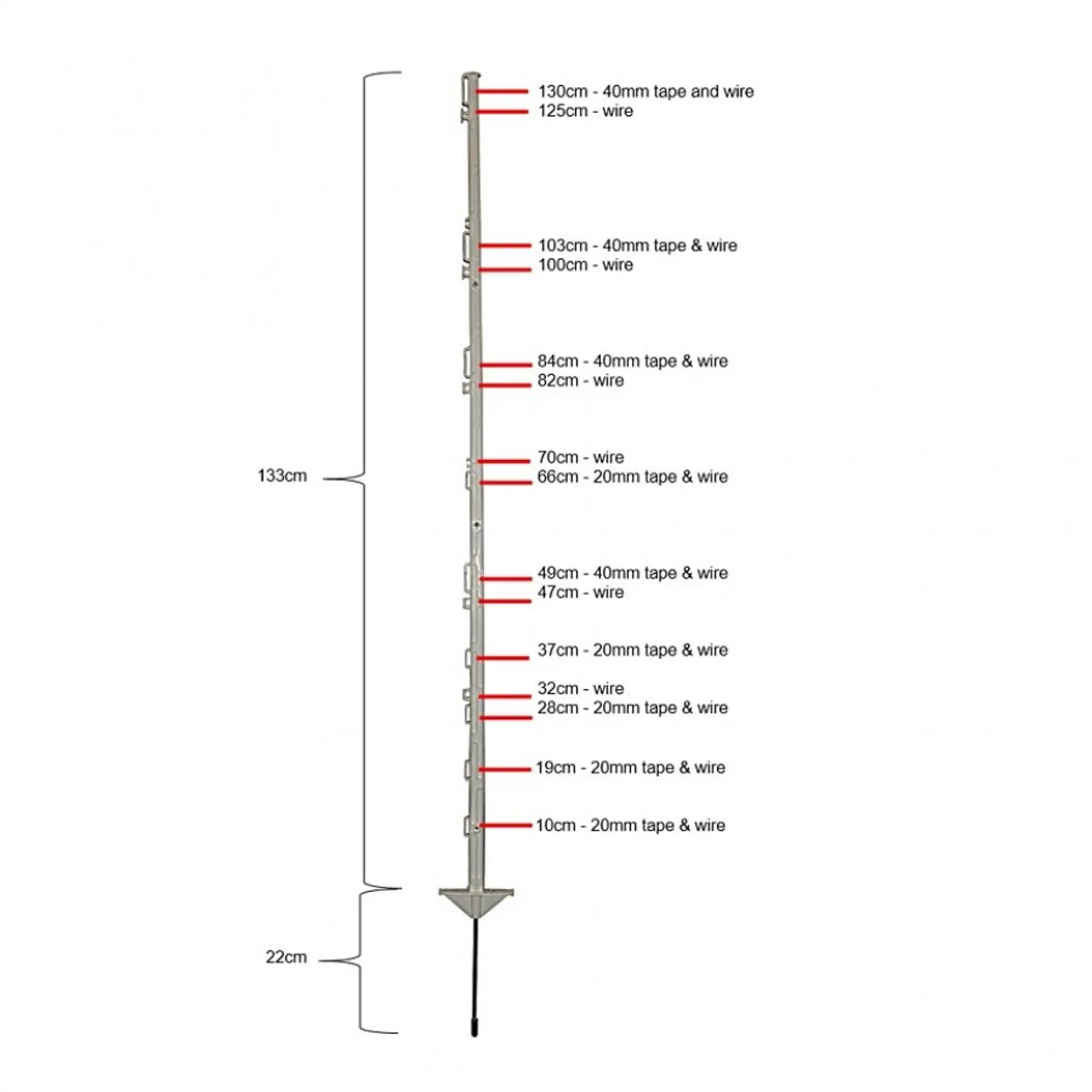 Witte kunststofpaal met een totale lengte van 1,55 m, met een maximale afrasteringshoogte van 1,30 m. Deze paal heeft 14 draadhouders, hiermee kan de draadhoogte en het aantal draden naar eigen wens vastgesteld kan worden. Geschikt voor kunststofdraad, koord en lint tot 40 mm.