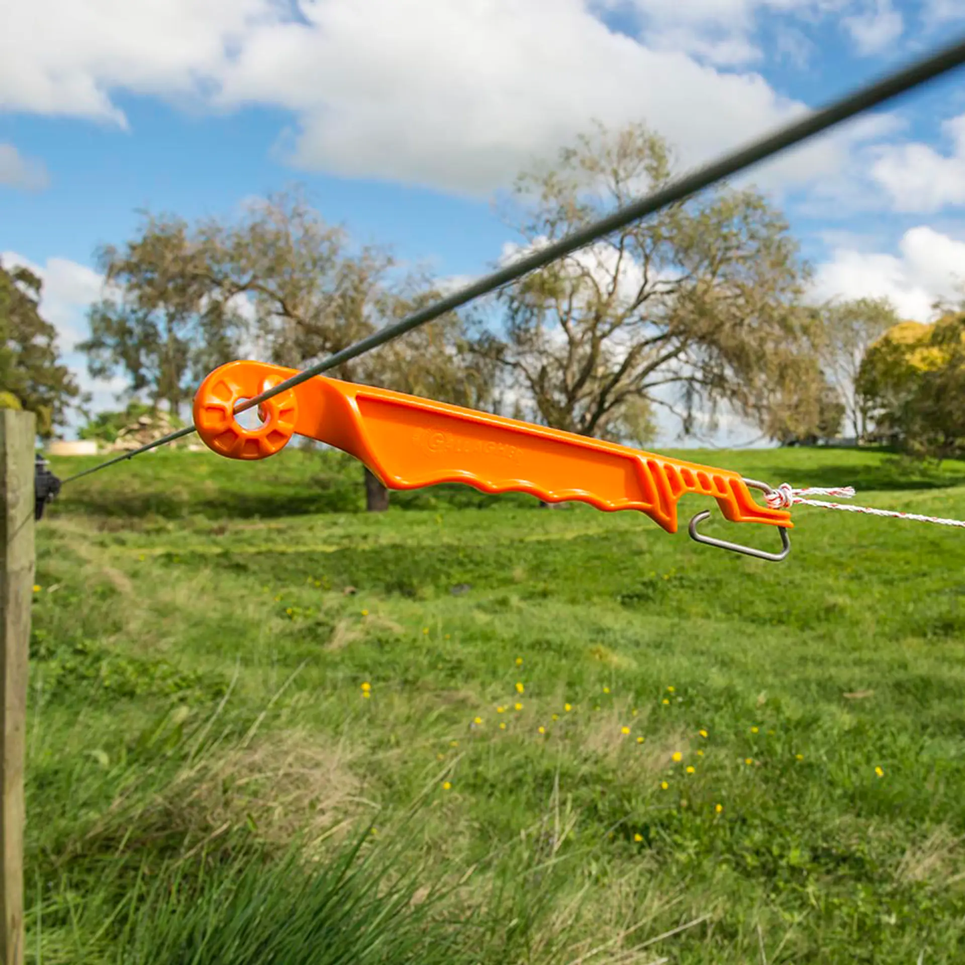 Door een lus in het schrikdraad te knopen, kan deze eenvoudig aan het oog in de handgreep worden bevestigd. Via de haak aan de handgreep aan de voorzijde wordt de stroom niet doorgegeven, via de metalen haak aan de achterzijde wel. Dit is handig als je de handgreep wil bevestigen aan bijvoorbeeld een stuk gaas. Door de oranje haak te gebruiken geef je de stroom vanaf de haspel niet door aan de gaasafrastering. In situatie waarin het gewenst is de stroom wel door te geven, kan de metalen haak gebruikt worden.
