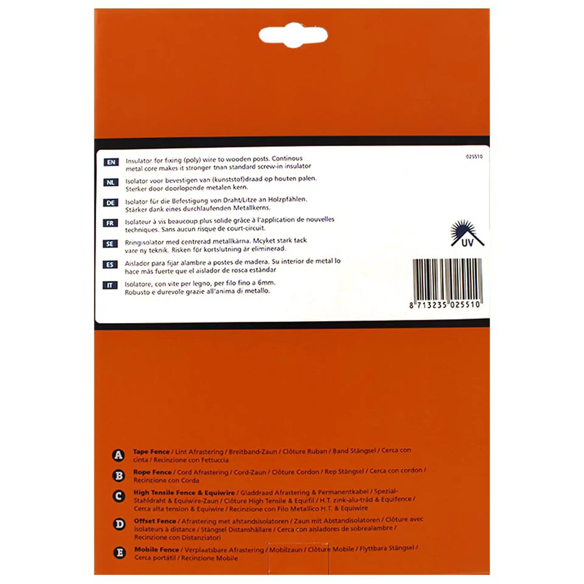 De XDI ringisolator is een zeer sterke ringisolator voor een houten paal die geschikt is voor cord en (kunststof)draad. Metalen kern exact in het midden waardoor de kans op kortsluiting nihil is. De oranje slijtindicator geeft aan wanneer de isolator vervangen moet worden. De ringisolator heeft een extra scherpe punt om de isolator in de paal te draaien.